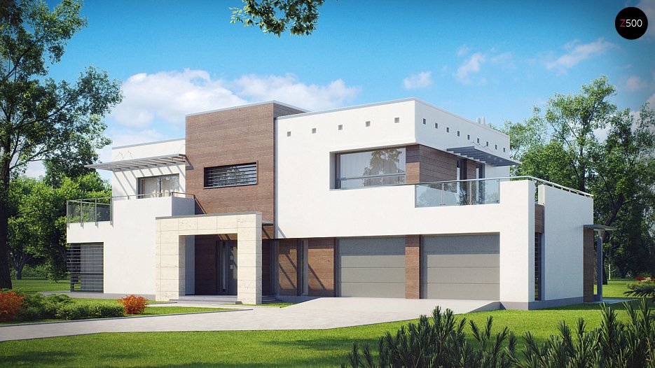 Podwariant z garażem dwustanowiskowym i lekko zmienioną elewacją frontową poprzez wsunięcie ściany zewnętrznej parteru. Nad dodatkowym miejscem postojowym zaprojektowano duży taras.