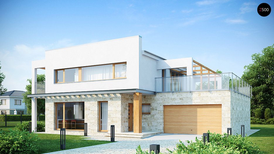 ZX5 wyróżnia prostota i nowoczesność. Podłużne okna, liczne przeszklenia, prawie płaski dach ukryty za attyką i taras na piętrze to tylko niektóre z zalet nowoczesnej architektury. Połączenie stali, egzotycznego drewna i ciosanego kamienia na elewacji doskonale komponuje się z chłodną bielą tynku.