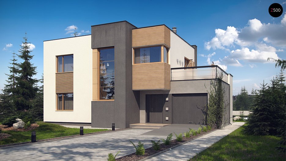 Zx59 to dom zaprojektowany w duchu modernistycznej architektury. Okładziny elewacyjne z naturalnego drewna oraz ciekawa kolorystyka podkreślają jego nowoczesny wygląd. Oryginalnym dodatkiem jest wykusz od frontu, w którym mieści się klatka schodowa. Duże okno idealnie doświetla strefę komunikacyjną oraz podnosi walory estetyczne.